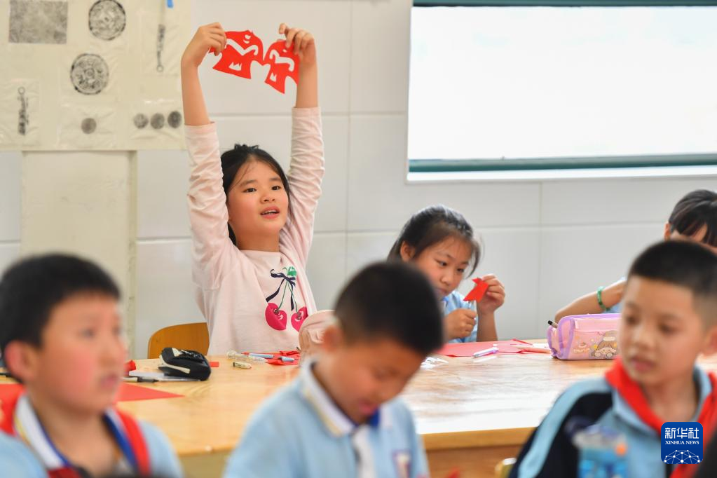 5月15日,在長沙市天心區(qū)紅衛(wèi)小學,學生在剪紙藝術課上展示作品。