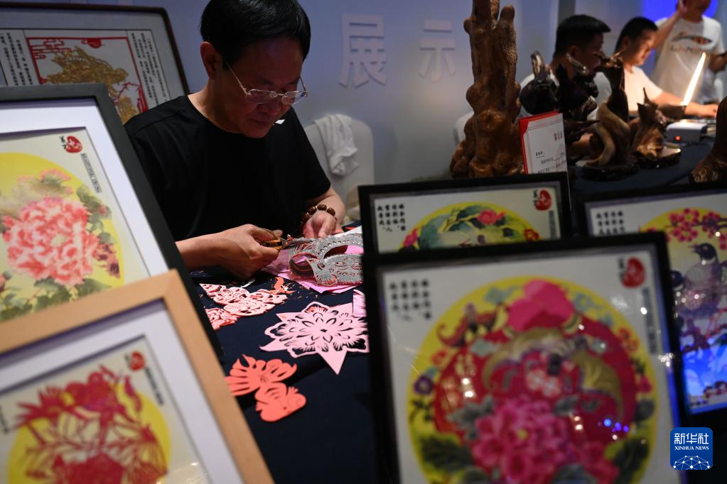 5月16日,民間藝人張林展示滿族手工剪紙技藝。