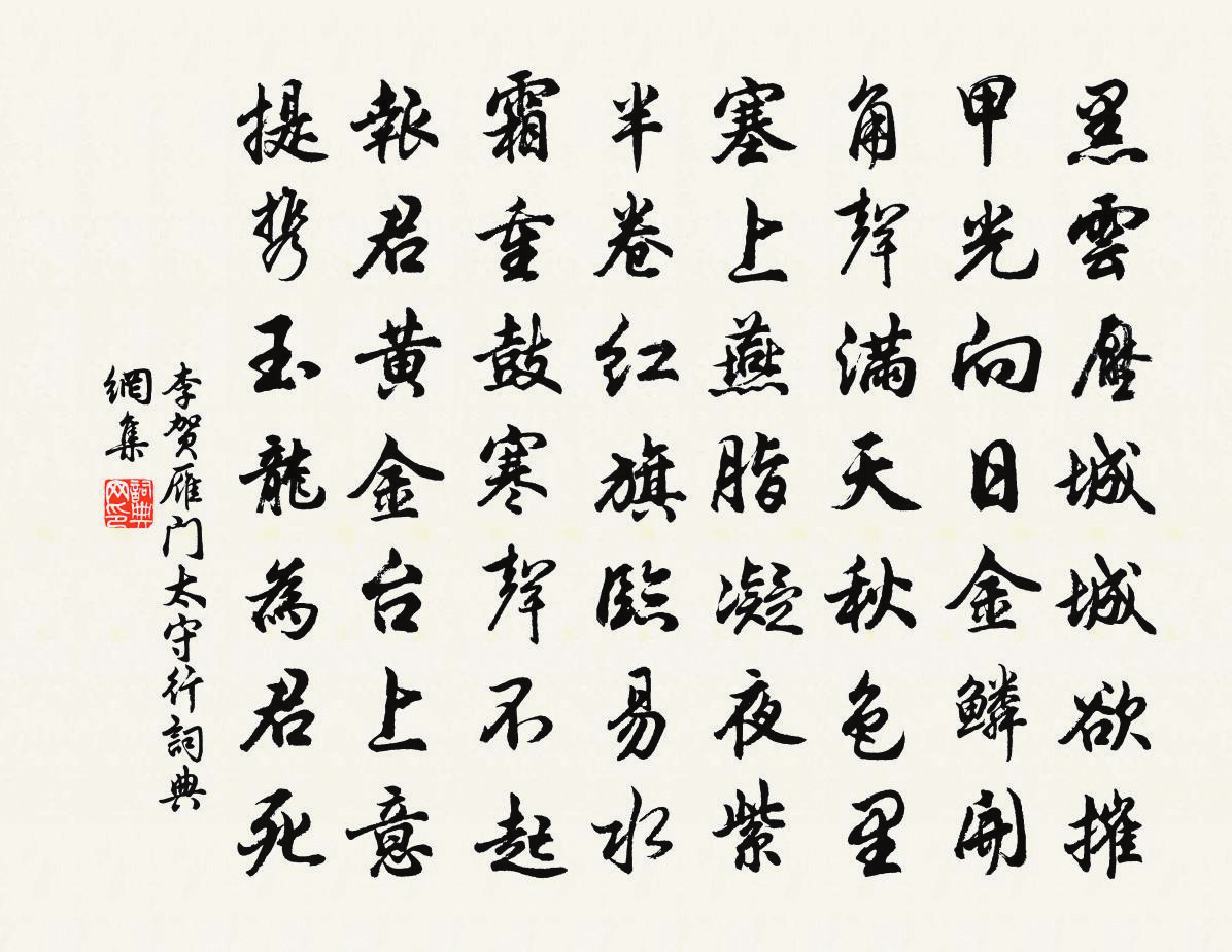 從詩仙手中接過筆的是“詩鬼”。李賀豪情萬丈,大筆一揮,筆走龍蛇,一幅巨作石破天驚,橫空出世。之所以說是一幅巨作,是因為李賀筆下的這首詩的確太像一幅畫了:“黑云壓城城欲摧,甲光向日金鱗開。角聲滿天秋色里,塞上燕脂凝夜紫。半卷紅旗臨易水,霜重鼓寒聲不起。報君黃金臺上意,提攜玉龍為君死。”