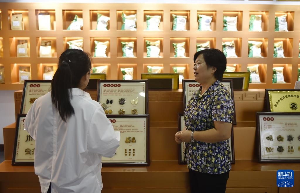 8月4日,在禹州中醫(yī)藥文化技藝傳習(xí)館,非遺項(xiàng)目“禹州中藥加工炮制技藝”代表性傳承人朱改蓮(右)向參觀者介紹中藥材知識(shí)。