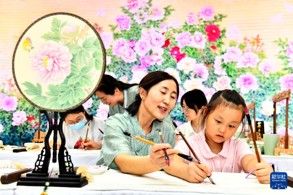 9月16日,在山東國(guó)際會(huì)展中心,來(lái)自巨野書(shū)畫(huà)院的藝術(shù)工作者姚愛(ài)紅教孩子給工筆牡丹畫(huà)上色。