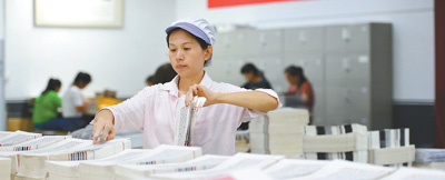 安徽省涇縣三希堂線裝文化園,工人正在原大影印摛藻堂本《欽定四庫(kù)全書(shū)薈要》生產(chǎn)線上忙碌。