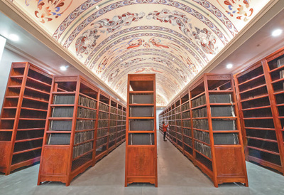國(guó)家版本館中央總館,工作人員在雕版庫(kù)房?jī)?nèi)巡查。