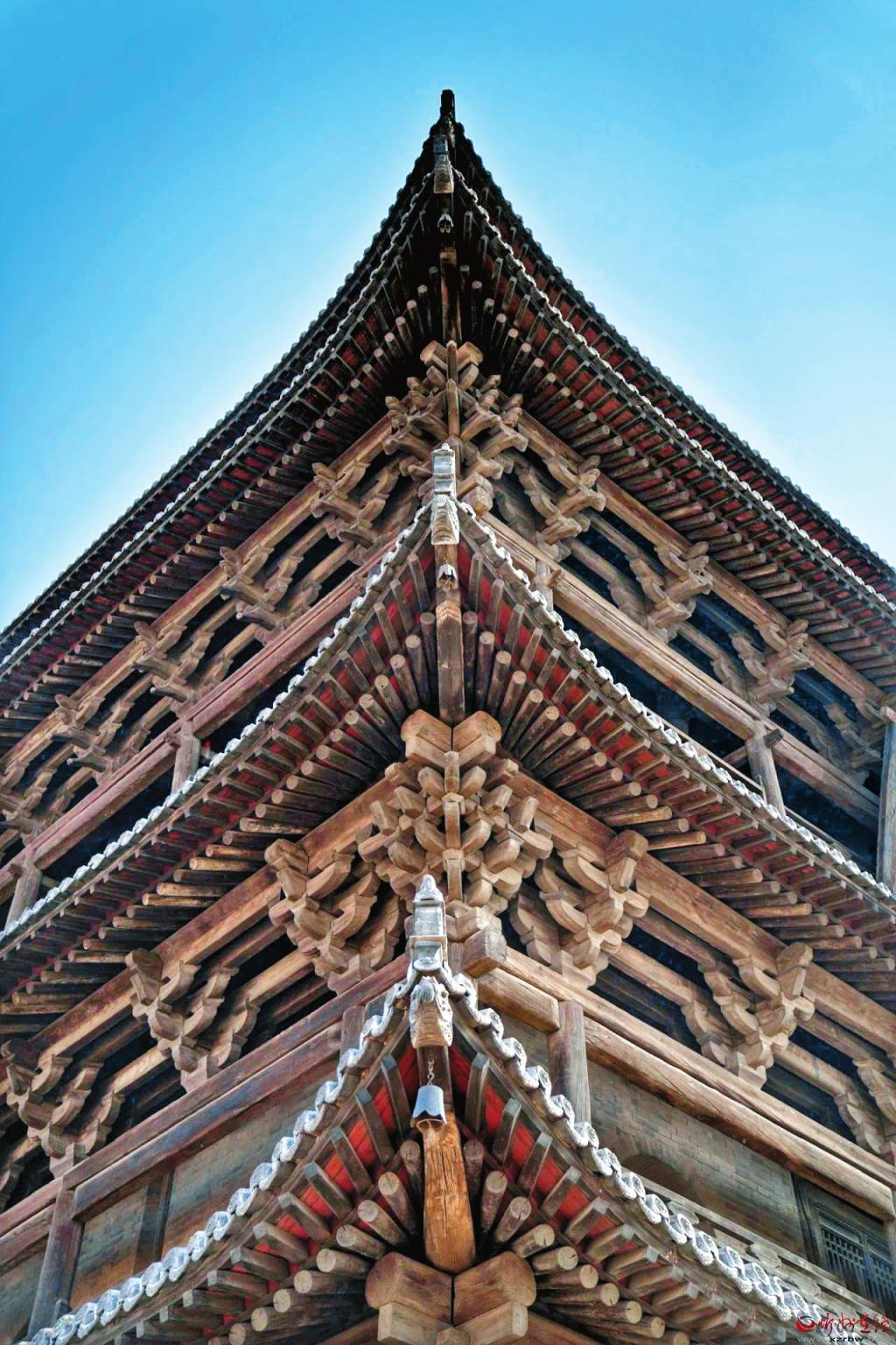 斗拱的分布,除柱頭科和角科外,前后檐明間平身科兩攢,次、梢間和兩山各間皆一攢。二層檐下施五踩雙翹頭,角科加施斜翹頭一縫。三層平座五踩雙翹頭,三層廊下施五踩重昂,三層上檐五踩雙下昂,角科加施角昂和由昂。角科正側(cè)兩面于當心翹頭外向增翹頭一列。斗拱制作規(guī)整,結(jié)構(gòu)精巧,構(gòu)造嚴密適度。