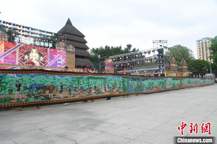 4月11日,2024年海南黎族苗族傳統(tǒng)節(jié)日“三月三”節(jié)慶活動主會場開幕式暨文藝演出在保亭黎族苗族自治縣舉行。圖為黎族民俗風(fēng)情黎錦長卷展示。張月和 攝