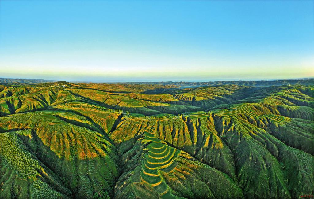 站在趙家溝的山頂看日出是一件賞心悅目的事情。8月4日早晨,當(dāng)朝陽從東方的山巒噴薄而出,在萬丈霞光的映照下,莽原織繡,梁峁吐翠,田疇如畫,生機(jī)勃發(fā)。居高臨下看到的夏日晉北高原美景妙不可言,使人陶醉。