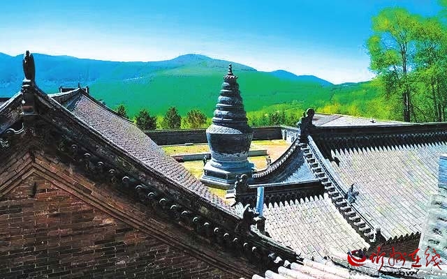 從忻臺旅游公路駛?cè)肱_豆線,燦爛輝煌的金閣古寺就位于南臺和中臺之間的金閣嶺上,海拔1900米,宛若天上宮闕。初秋時節(jié),遠(yuǎn)處山色空蒙,峰巒凝碧,近處樹蔭蔽日,曲徑通幽。累代的晨鐘暮鼓及戰(zhàn)亂的刀光劍影都散落在歲月深處,輕柔的風(fēng)拂過往事滄桑。