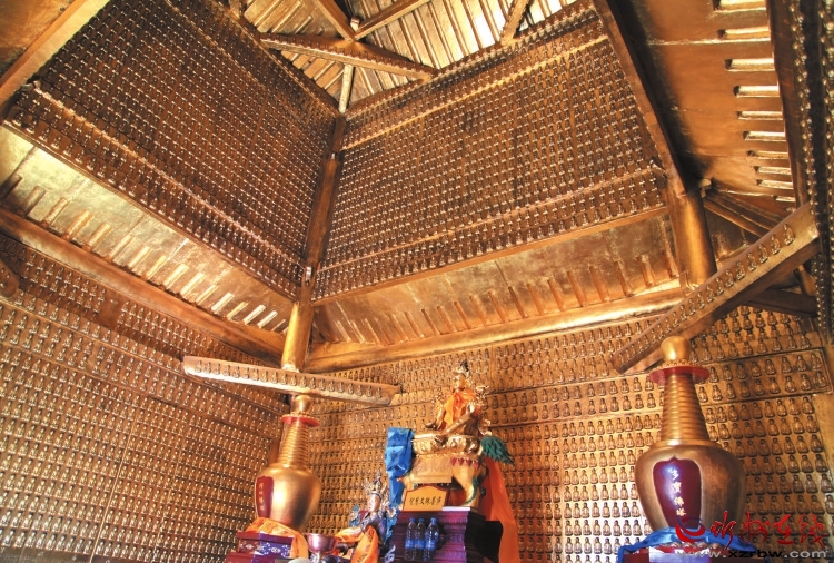 隔扇外壁鑄有36幅花卉圖案,有二龍戲珠、魚(yú)躍龍門(mén)、犀牛望月、玉兔拜月等,構(gòu)圖清晰,形象生動(dòng)。殿內(nèi)四壁滿(mǎn)鑄小佛,號(hào)稱(chēng)萬(wàn)佛,佛像形態(tài)各異,栩栩如生。殿內(nèi)正中供奉著一尊高達(dá)1米的銅鑄文殊騎獅像,其鑄藝高超,神態(tài)逼真,體態(tài)閑適,是明代銅鑄佛像之珍品。