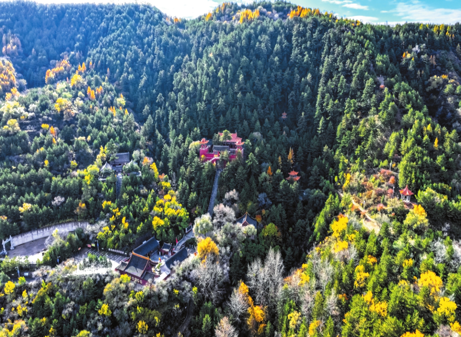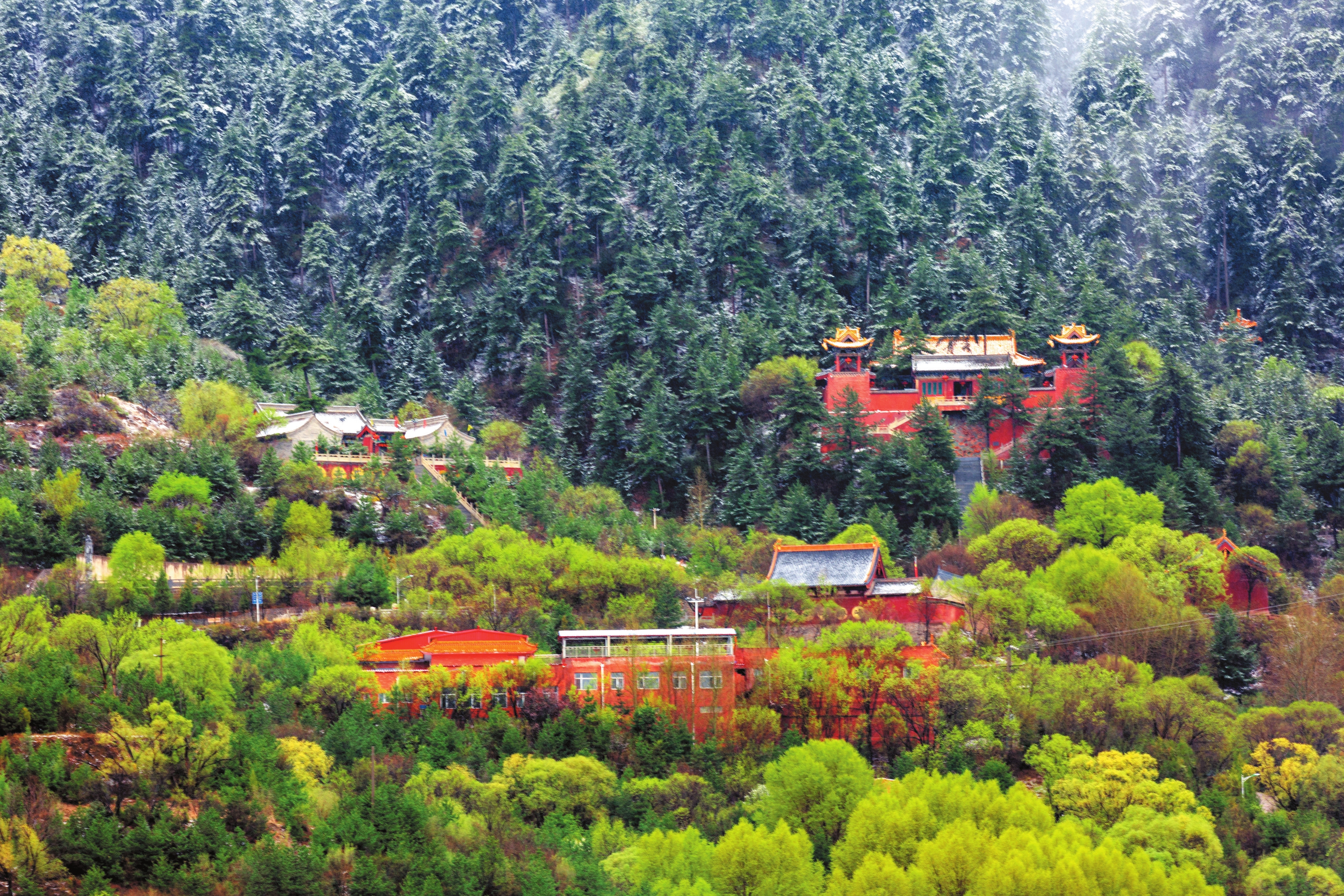 山林間宏大的廟宇建筑群始建于北魏時(shí)期,憑借清幽秀麗的自然風(fēng)光和深厚的文化底蘊(yùn),吸引了眾多高僧來(lái)此傳經(jīng)布道。隨著佛教文化的發(fā)展,與之相關(guān)的建筑藝術(shù)、雕塑藝術(shù)、壁畫(huà)藝術(shù)歷代都有發(fā)展,可惜大部分毀于戰(zhàn)火。1992年開(kāi)始重建,集儒釋道于一體的廟宇群規(guī)模宏大。
