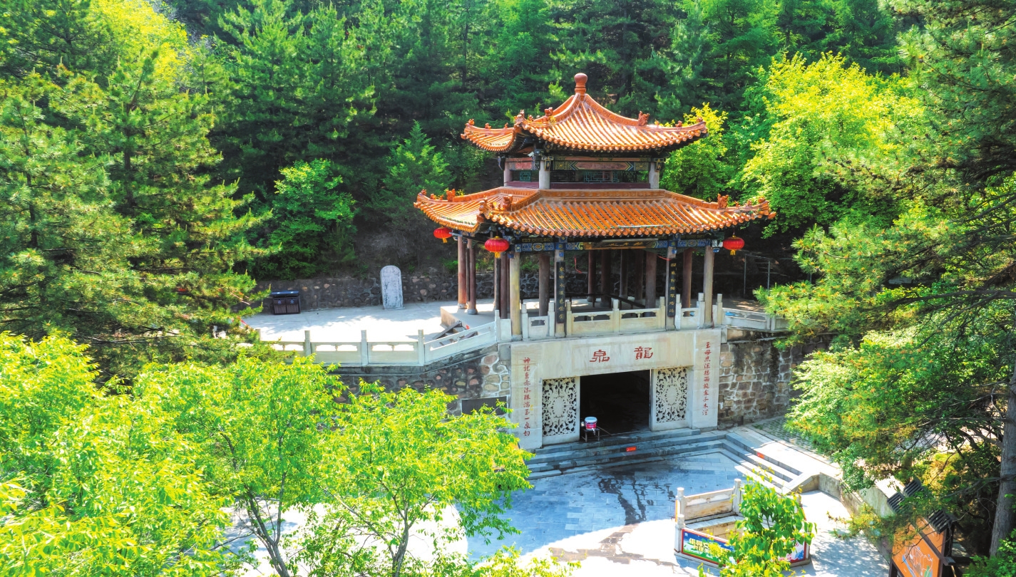 山有水而媚,土得水而沃。從大雄寶殿出來(lái),沿著西門(mén)旁一條小道不遠(yuǎn)處,就是那片號(hào)稱(chēng)“天柱松濤”的松林了。只見(jiàn)樹(shù)干筆直,枝條蒼勁,直指云霄,林間松脂飄香,氣息悠然。人還在松林中流連尋芳,遠(yuǎn)遠(yuǎn)就能聽(tīng)到聞名已久的“天柱龍泉”在流淌。龍泉位于景區(qū)廟群西南的龍泉閣,作為“靜樂(lè)舊八景”之首的“天柱龍泉”,又名“犬舐泉”,《魏書(shū)》載:“爾朱榮高祖羽健居北秀容川。會(huì)有狗舐地,因而穿之,得甘泉,故名?!毕鄠魅谐錾颀垼拭埲?。高山出泉是為奇觀,泉水清澈見(jiàn)底,旱不涸、澇不盈,夏飲清神,冬飲沁心。有“天柱圣境啟心智,龍泉奇觀令神怡”之頌。此泉水富含多種礦物質(zhì)和微量元素,是地地道道的“天然級(jí)礦泉水”。近幾年上山鍛煉的居民很多,人們上山時(shí)自帶裝水工具,攜泉水以做飯和飲用,期盼著龍泉水能給人帶來(lái)健康和好運(yùn)。站在龍泉邊,總能感受到一陣陣濕潤(rùn)的水氣撲面而來(lái),甚至像風(fēng)一樣輕繞著周身,使人置身于自然美景中不愿離開(kāi),連呼吸也變得無(wú)比暢快起來(lái)。