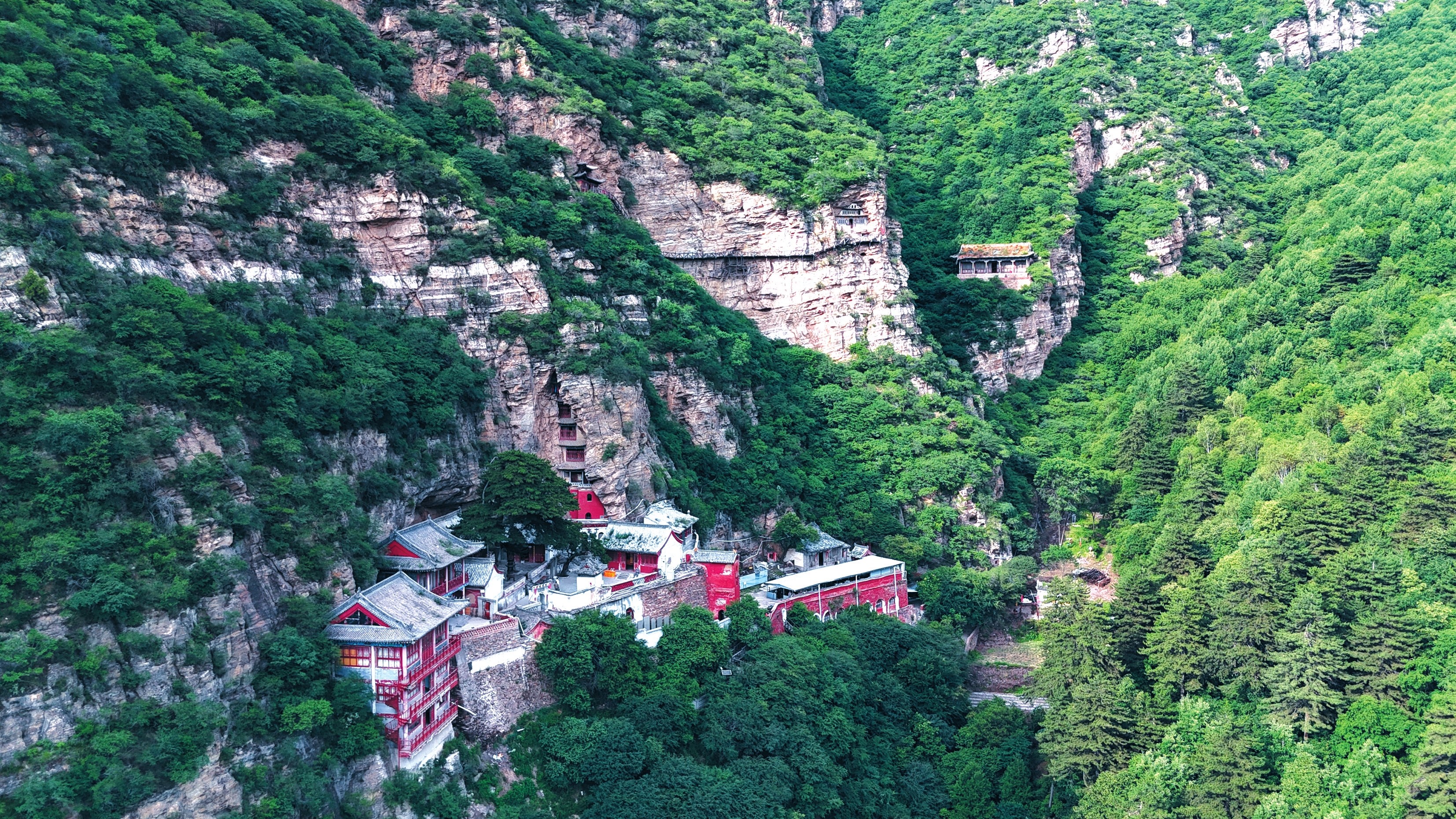 九仙女洞西北,是仙閣登云洞,堪稱奇絕之冠。三重樓閣懸嵌于萬仞絕壁,后方倚石洞建重檐,上層塑太上老君、元始天尊、通天教主三像,中層塑關(guān)帝像,匾額高懸“橫空出世”。上下竟無棧道可通,唯數(shù)丈鐵鏈垂于虛空。攀援者需手足并用,引身而上。至半山腰,更有凸巖如蓋板阻路,鐵索于此乍然懸空,需奮力蕩環(huán),方得續(xù)攀。此閣盡得“玄、險、奇、絕”之真味,趙杲觀因此贏得“雁門懸空寺”的驚世美名。