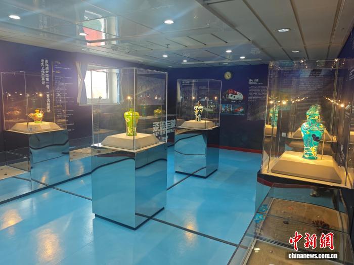 10月13日,全國首家海上流動博物館升級改造落成儀式在三亞舉行。圖為“南海之夢”號郵輪上全新推出的“深藍(lán)寶藏——南海西北陸坡一二號沉船考古成果特展”主題展覽。張月和 攝