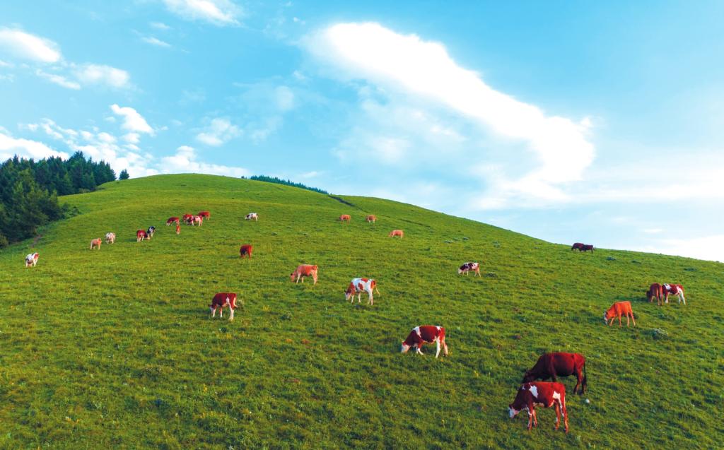 夏之爽,清涼自生的愜意。當(dāng)酷暑的熱浪在平川上肆虐,金山梁卻以其巍峨的身軀,將喧囂與燥熱溫柔地阻擋在外。這里平均氣溫較山下低五六攝氏度,即便是最難熬的三伏天,氣溫也鮮少超過(guò)二十?dāng)z氏度,儼然一處天賜的清涼福地。廣袤的草甸是它獻(xiàn)給夏日最柔軟的綠毯,厚實(shí)、松軟,綿延至天際。成群的牛羊散臥其間,安然地啃食著青草。成片的松林則是它撐開的巨傘,郁郁蔥蔥,遮天蔽日。風(fēng)過(guò)處,松濤涌動(dòng),那低沉而富有磁性的回響,為靜謐的夏日注滿了深邃的生機(jī)。放眼四野,胡麻花成片怒放,匯成藍(lán)色的波浪,仿佛要與天際相接;土豆花則素雅地點(diǎn)綴在田間,潔白的花瓣鑲嵌在青色的田疇上。采藥人身影靈動(dòng),穿行于榛莽之間,背后的簍子里,黃芪、柴胡