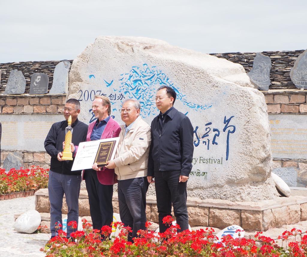 6月29日,吉狄馬加(右二)為澳大利亞詩人馬克·特雷尼克(左二)頒獎(jiǎng)。新華社記者 白瑪央措 攝