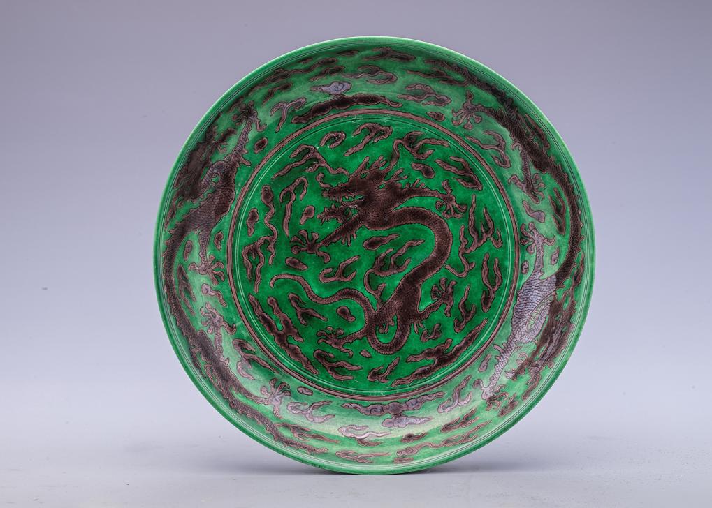 展出的清康熙紫綠彩龍紋盤。