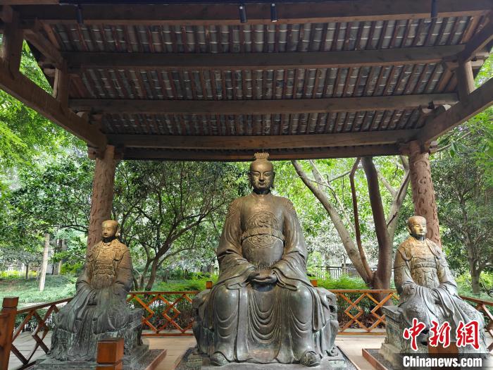 在四川博物院,“長(zhǎng)江之神”戶(hù)外常設(shè)展迎來(lái)大批觀(guān)眾?,F(xiàn)場(chǎng)立有明代江瀆神青銅像,鑄造工藝精美,青銅像身上的銘文記載了鑄造起因和有關(guān)江瀆祠建造的記錄。