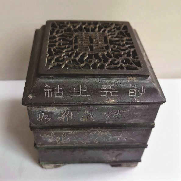 約二十年前,筆者在文物商店見到一只篆香方爐,形制規(guī)整小巧,鑄造典雅大氣,寓意吉祥,且價(jià)格不貴,便將其收入囊中。