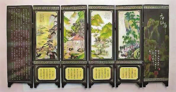 我收藏的仿古“唐畫”小屏風(fēng),為木結(jié)構(gòu)框架、彩繪屏面,共由六扇面組成,高24厘米,每扇屏寬7.5厘米,六扇總寬45厘米,質(zhì)料細(xì)膩,工藝精致,色澤鮮艷,紋理清晰。屏面上印有明代畫家唐寅的《美人對(duì)月》《桃花庵歌》《花下酌酒歌》《閶門即事》等畫作。