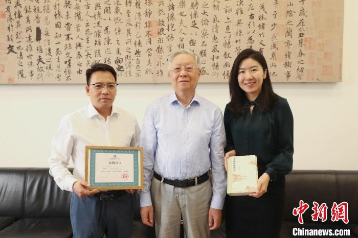 李紅強(qiáng)總編輯(左)代表人民文學(xué)出版社向國(guó)家圖書(shū)館捐贈(zèng)《莫礪鋒演講錄》一種三冊(cè),霍瑞娟副館長(zhǎng)(右)代表國(guó)家圖書(shū)館接受捐贈(zèng)并頒發(fā)證書(shū)。儀式后雙方與莫礪鋒教授(中)合影。 主辦方供圖