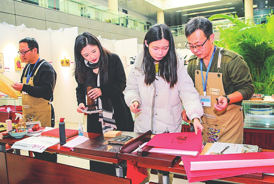 學(xué)生們現(xiàn)場(chǎng)學(xué)習(xí)制作木版年畫。