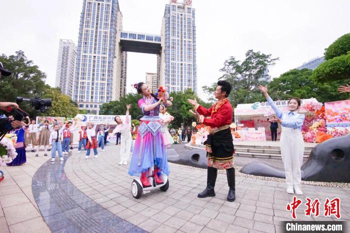 此外,在“廣西三月三·八桂嘉年華”開幕式暨“四季村歌”活動(dòng)啟動(dòng)儀式上,廣西戲劇院“新劉三姐”扮演者陳慧身著絢麗民族盛裝,攜手多地游客共唱山歌,融合平衡車表演和戲曲唱腔的演繹方式,展現(xiàn)廣西山歌與時(shí)俱進(jìn)演變過程,為廣西“三月三”這場民族盛會(huì)添新潮。