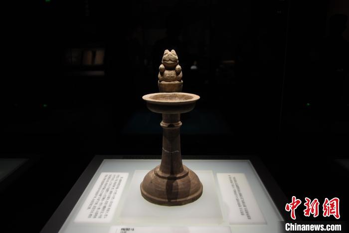 7月16日,河南洛陽漢魏洛陽故城遺址博物館,西晉時(shí)期“招財(cái)貓”造型的陶熨斗亮相。 王宇 攝