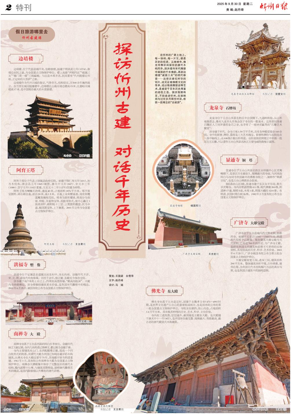 在忻州的廣袤土地上,每一塊磚、每一片瓦,都是歷史的低語。從南禪寺、佛光寺榫卯間留存的唐代木構(gòu)風(fēng)華,到洪福寺宋代雕塑中凝固的千年佛韻,再到邊靖樓“威鎮(zhèn)三關(guān)”的明代雄姿……這些古建似時空的切片,或見證著佛教文化的傳承,或以精美雕塑詮釋藝術(shù),是感受千百年歷史厚重的絕佳之選。國慶假期將至,不妨走進(jìn)忻州,在凝眸間與過往歲月隔空對話,收獲一段難忘的“古建游”。