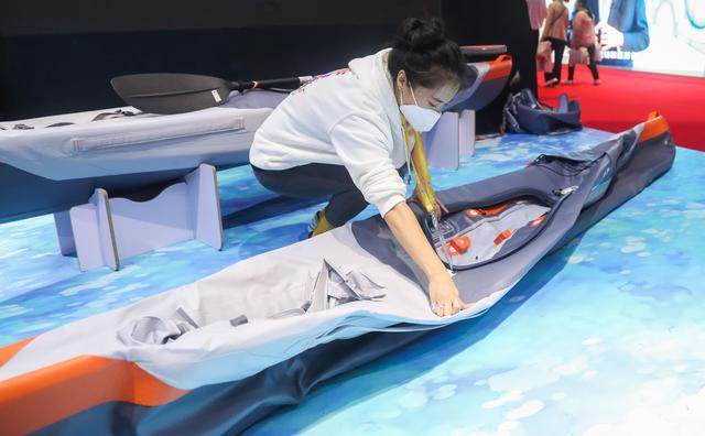 11月6日,工作人員在進(jìn)博會消費品展區(qū)的迪卡儂展臺演示可折疊皮劃艇如何安裝。新華社記者 丁汀 攝