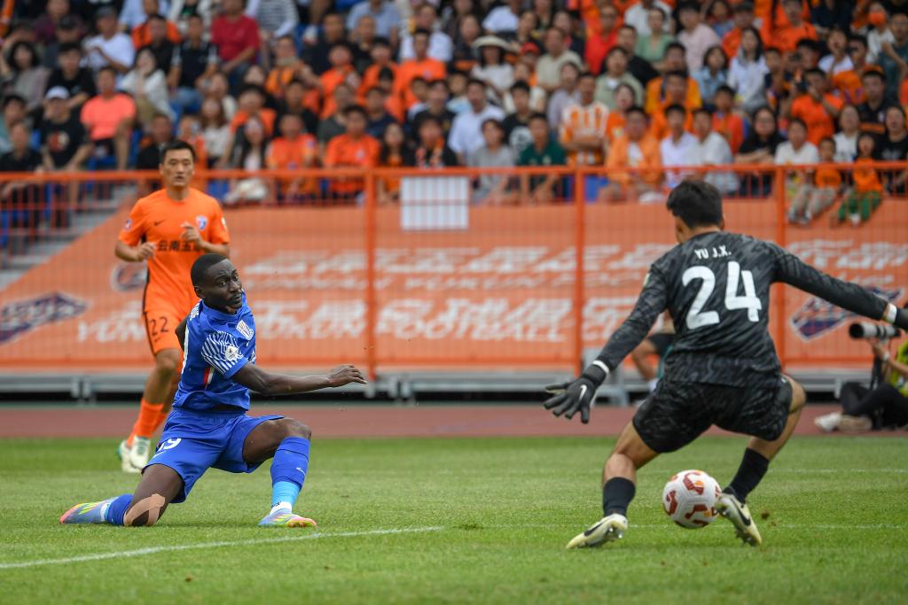 8月2日,上海申花隊球員阿蘇埃(前左)在比賽中射門。新華社記者 彭奕凱 攝