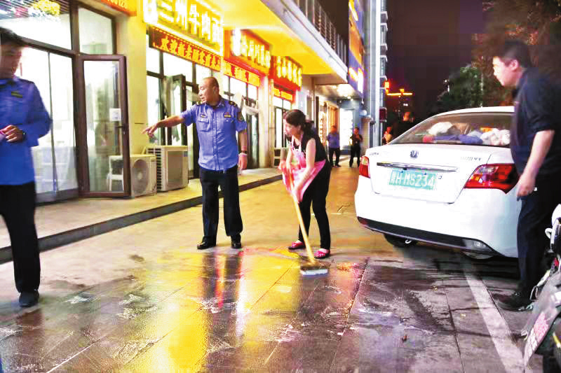 據(jù)了解,此次行動共出動執(zhí)法人員近30名。通過專項整治,進一步規(guī)范了城區(qū)商鋪的經(jīng)營秩序,提升了居民的環(huán)保意識和文明意識,營造了和諧文明的市容環(huán)境。圖為執(zhí)法人員與商家一同清理店鋪門前油污。(記者張志遠 攝影報道)