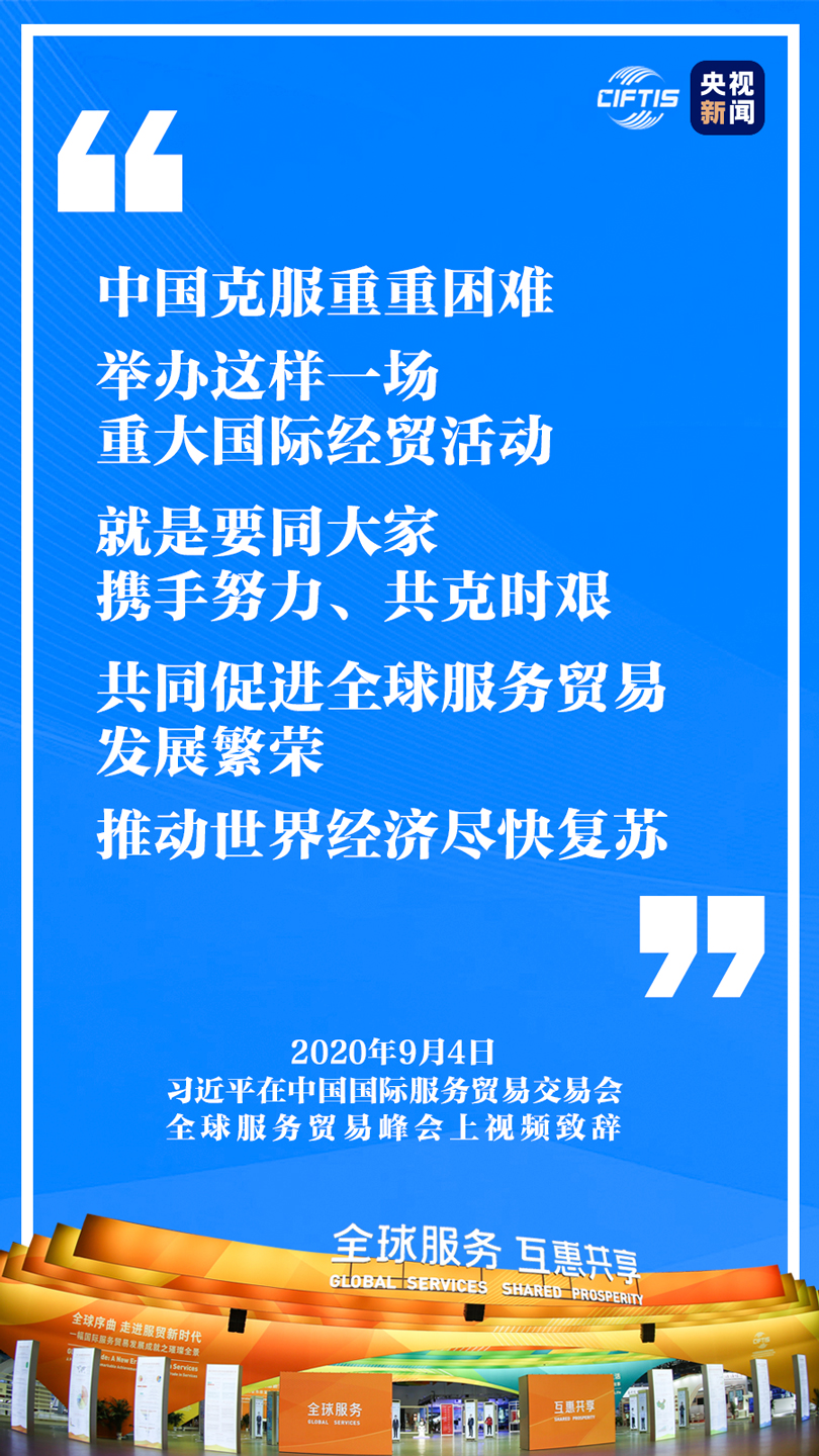 中國(guó)克服重重困難,舉辦這樣一場(chǎng)重大國(guó)際經(jīng)貿(mào)活動(dòng),就是要同大家攜手努力、共克時(shí)艱,共同促進(jìn)全球服務(wù)貿(mào)易發(fā)展繁榮,推動(dòng)世界經(jīng)濟(jì)盡快復(fù)蘇。