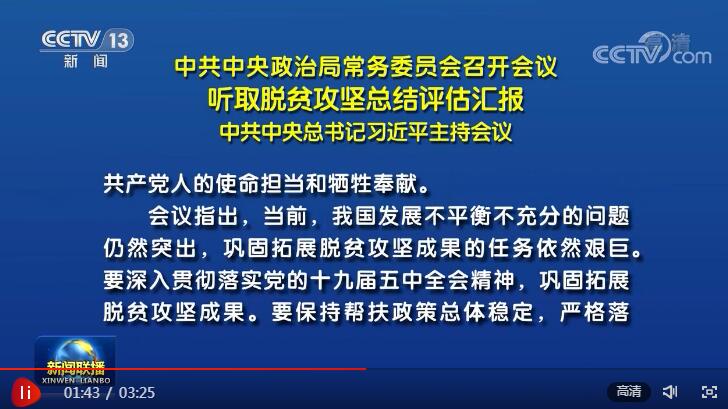 12月3日,中共中央政治局常務(wù)委員會(huì)召開(kāi)會(huì)議,聽(tīng)取脫貧攻堅(jiān)總結(jié)評(píng)估匯報(bào)。習(xí)近平總書(shū)記主持會(huì)議并發(fā)表重要講話(huà)。在講話(huà)中,總書(shū)記總結(jié)了黨的十八大以來(lái)脫貧攻堅(jiān)工作取得的成績(jī),肯定了各級(jí)黨委和政府以及社會(huì)協(xié)同發(fā)力、合力攻堅(jiān)的卓越付出。央視網(wǎng)《聯(lián)播+》特梳理講話(huà)及會(huì)議要點(diǎn),以饗讀者。