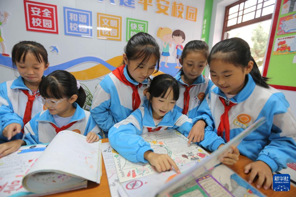 9月11日,甘肅省定西市安定區(qū)東關小學的學生利用手抄報學習網(wǎng)絡安全相關常識。(新華社發(fā) 王克賢 攝)