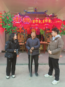 呂梁記者站記者要佳(左)、秦嘉良(右)在柳林縣穆村鎮(zhèn)沙曲村采訪國家級非物質(zhì)文化遺產(chǎn)代表性項目——盤子會。