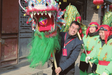 臨汾記者站記者郭玉琴(左二)在臨汾市水門街采訪“洋媳婦”扎拉過中國年。