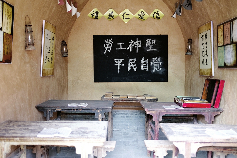 推開堆云洞一層側(cè)院展廳木門,明媚的陽光照進(jìn)教室,黑板上“勞工神圣平民自覺”8個(gè)粉筆字赫然在目,老舊的桌椅、殘留的坑道、銹跡斑斑的馬燈,雖已被時(shí)間抹去了原有的模樣,但仍時(shí)刻警醒著后人勿忘國恥。