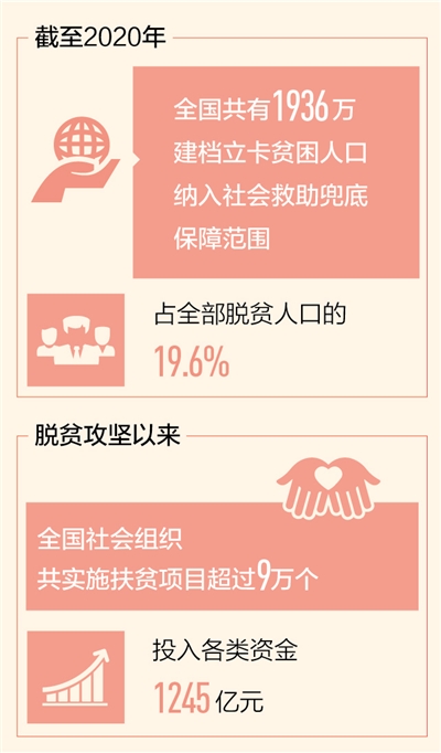 習(xí)近平總書(shū)記指出,民政工作關(guān)系民生、連著民心,是社會(huì)建設(shè)的兜底性、基礎(chǔ)性工作。決戰(zhàn)決勝脫貧攻堅(jiān),民政部門以完善制度機(jī)制、聚焦特殊群體、助力重點(diǎn)地區(qū)攻堅(jiān)等政策“組合拳”,兜住最困難群體,保住最基本生活。數(shù)據(jù)顯示,截至2020年,全國(guó)共有1936萬(wàn)建檔立卡貧困人口納入社會(huì)救助兜底保障范圍,占全部脫貧人口的19.6%,脫貧地區(qū)群眾獲得感、幸福感、安全感不斷提升。