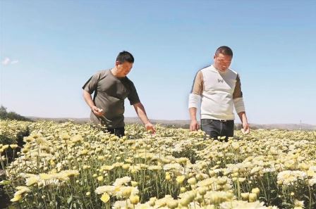 有了方向,行動是關(guān)鍵。黨員徐大衛(wèi)主動請纓,第一時間不遠千里趕赴菊花主產(chǎn)區(qū)射陽考察菊花種植項目,經(jīng)過充分分析研判,篩選適宜五寨種植的品種,最終選定北京菊試種。同時,他帶著誠意誠心,從射陽請來3名技術(shù)專家。在晉西北中藥材產(chǎn)業(yè)孵化園附近,他與3位專家同吃同住,深入田間地頭,與群眾同勞作、共生活。依據(jù)菊花種植要求,手把手教會群眾平整土地、開挖溝槽、栽種澆水、鋤草施肥和采挖收儲等中藥材精耕細作技術(shù)。針對菊花農(nóng)殘、重金屬超標的問題,在試種過程中,他精心研究、反復摸索,大膽探索出了一套適用于菊花的種植技術(shù),實現(xiàn)了菊花農(nóng)殘可控的突破,先試種的100畝菊花,獲得了成功。