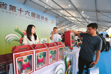 8月9日,大同市體育中心內(nèi),第十六屆省運(yùn)會(huì)吉祥物(翔翔)專(zhuān)營(yíng)區(qū)吸引不少觀眾前來(lái)選購(gòu)。