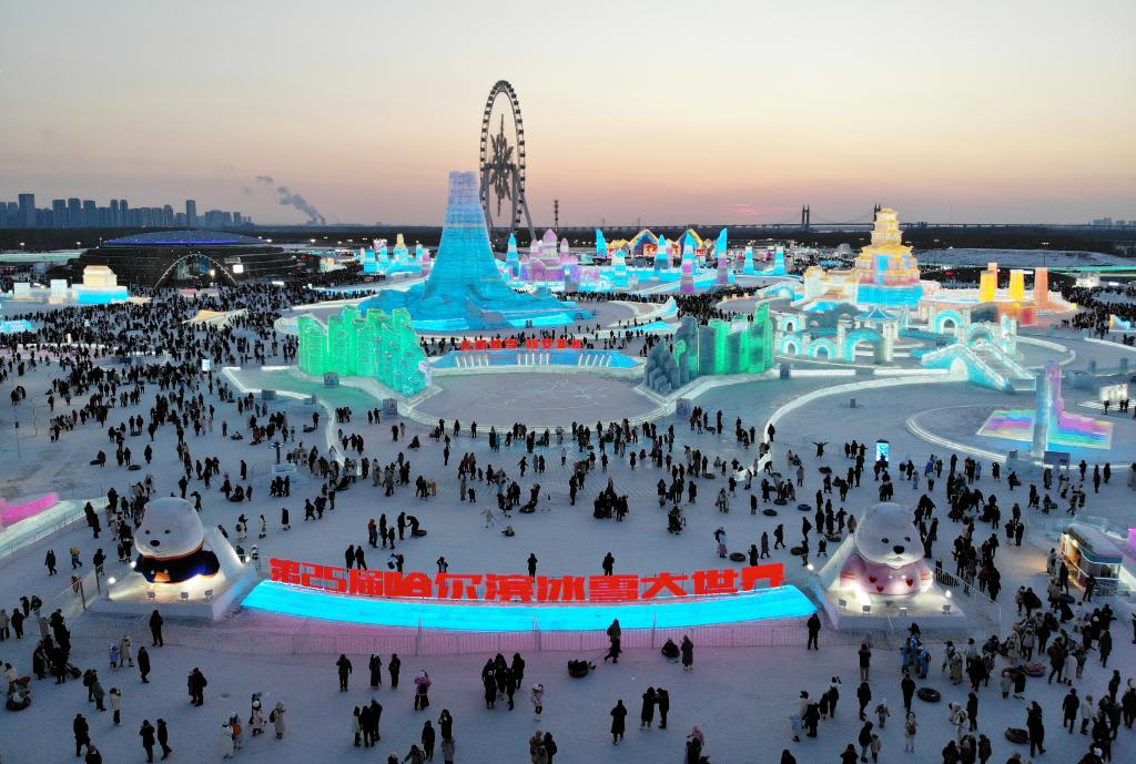 2月15日,游客在哈爾濱冰雪大世界園區(qū)內(nèi)游玩(無人機(jī)照片)。新華社記者 王建威 攝