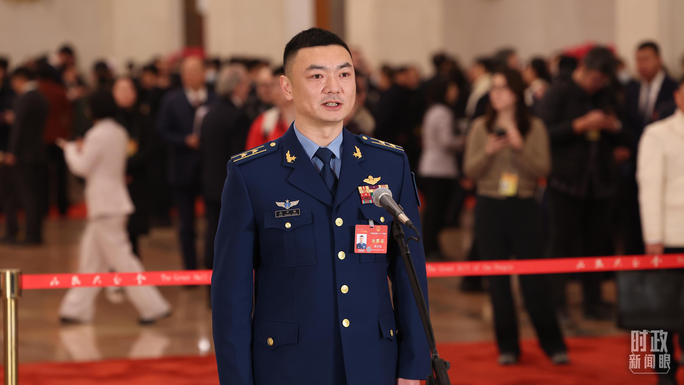 △2024年3月5日,十四屆全國(guó)人大二次會(huì)議首場(chǎng)“代表通道”集中采訪活動(dòng)中,全國(guó)人大代表、空軍航空兵某旅副參謀長(zhǎng)高中強(qiáng)正在答記者問。(圖/視覺中國(guó))