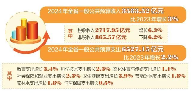 收支管理是財政工作的核心。按照政府預(yù)算報告,2024年全省一般公共預(yù)算收入3583.52億元,比2023年增長3%。其中,稅收收入2717.95億元,增長6.3%;非稅收入865.57億元,下降6.2%。全省一般公共預(yù)算支出6527.15億元,比2023年增長2.2%。其中,教育支出增長3.4%,科學(xué)技術(shù)支出增長2.3%,文化體育與傳媒支出增長1.1%,社會保障和就業(yè)支出增長2.3%,衛(wèi)生健康支出增長3.9%,節(jié)能環(huán)保支出增長1.8%,農(nóng)林水支出增長1.8%,住房保障支出增長0.5%。