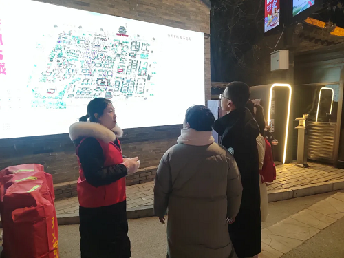 在涌動的人流中,一抹“志愿紅”格外醒目。在古城的各個區(qū)域,法院干警身著統(tǒng)一的服裝,熱情地為游客拍照、打卡、掃碼,宣傳介紹古城的旅游景點,還為游客提供路線指引、問題解答、失物協尋等幫助,古城內隨處可見他們忙碌的身影。