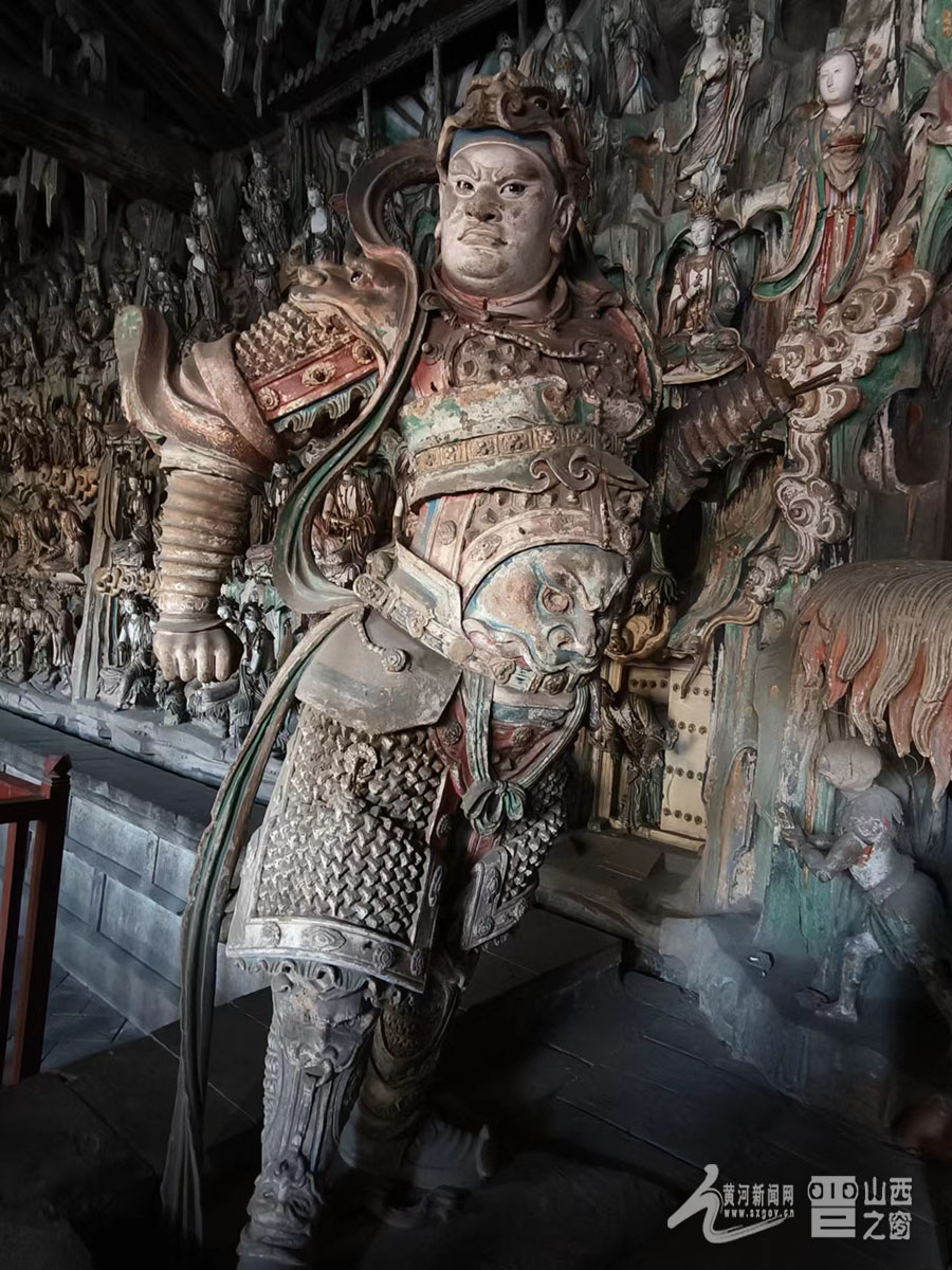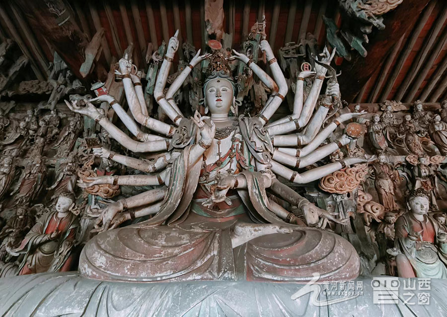 寺內(nèi)擁有總計(jì)2000多尊彩塑,大者丈余、小者尺許,每一壁龕為一獨(dú)立神話或佛教故事,人物造型生動,神態(tài)逼真,尤其以“千手觀音像”與“韋馱像”最為經(jīng)典。舞蹈《千手觀音》的靈感原型就是這尊千手觀音像。塑像高達(dá)數(shù)米,全身貼金,背后伸出上千只手臂,每只手掌上都有一只眼睛,錯落有致,整個造像氣勢恢宏,達(dá)到雕塑藝術(shù)中和諧、完美的境界。韋馱像巍然肅立,身披甲胄,神情凝重,整個身體呈現(xiàn)出一種微妙的動態(tài)平衡,是明代彩塑中少見的藝術(shù)杰作,被譽(yù)為“天下第一韋馱”“全國韋馱之冠”。景區(qū)講解員侯麗娟介紹:“這尊塑像的高明之處就在于匠師不落俗套,打破了一般程式的限制,賦予了韋馱一種時(shí)間的節(jié)奏性和動作的連續(xù)性,產(chǎn)生了雕塑作品的最高境界‘不動之動’?!?/p>