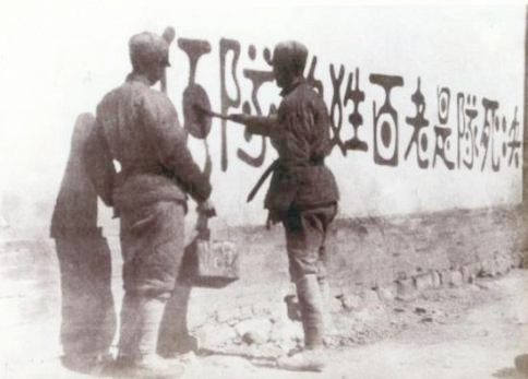 圖2 山西新軍既是戰(zhàn)斗隊(duì),又是工作隊(duì)。他們走到哪里,宣傳到哪里,動(dòng)員青年參軍;組織人民武裝自衛(wèi)隊(duì)、游擊隊(duì);協(xié)助地方建黨、建政,組建工、農(nóng)、青、婦等群眾團(tuán)體,創(chuàng)建抗日根據(jù)地。圖為1938年初,決死隊(duì)?wèi)?zhàn)士在沁縣書寫宣傳標(biāo)語。