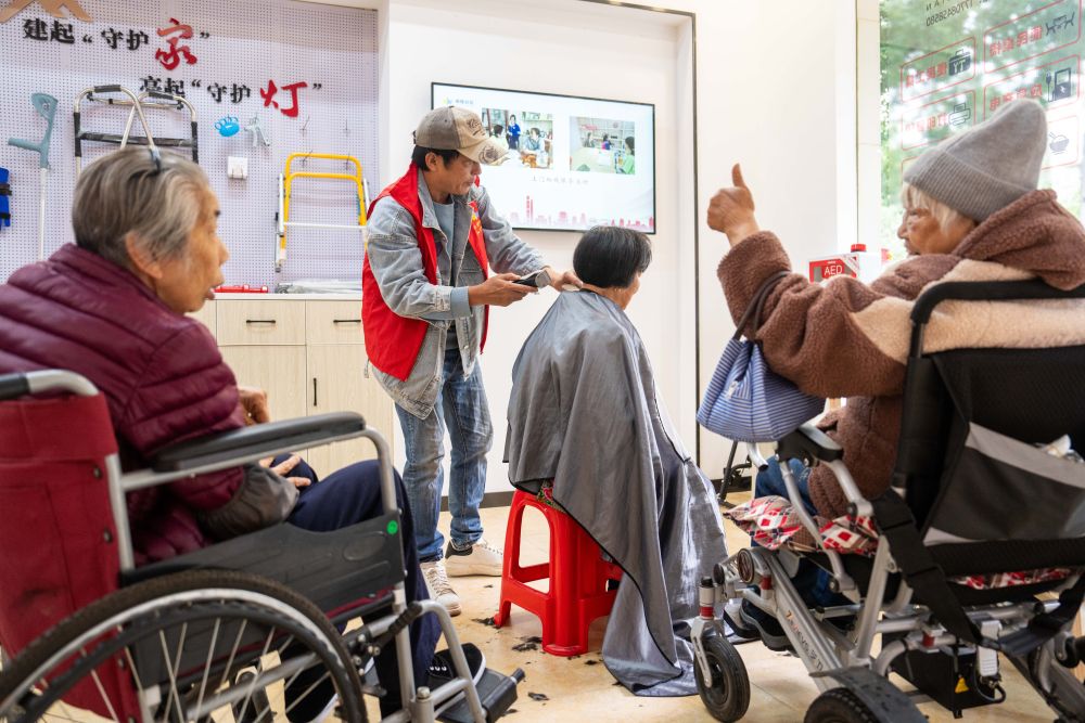 2025年11月6日,在湖南省長沙市望城區(qū)高塘嶺街道湘陵社區(qū),志愿者為老年人和殘疾人士免費(fèi)理發(fā)。新華社記者 陳思汗 攝